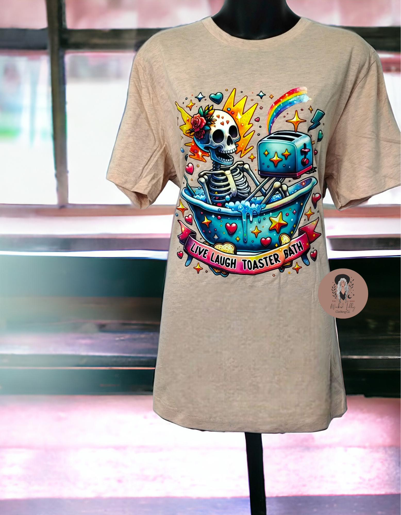 Ah, the classic trio: live, laugh, toaster bath. Wait, what? Surely, you meant to say "live, laugh, love," but let's entertain this quirky twist with a touch of sarcasm. Because who wouldn't want to combine the joys of life and laughter with the sheer danger of an electrical appliance in the bath, right? In reality, of course, the idea of a "toaster bath" is a darkly humorous way to highlight the absurdity of mixing pleasure with peril. It's a reminder that while it's great to embrace life's whimsical moments, some combinations are best left as jokes rather than reality. So, let’s stick to living, laughing, and loving—keeping our toasters far away from the tub. Just stick to ordering the shirt ok…